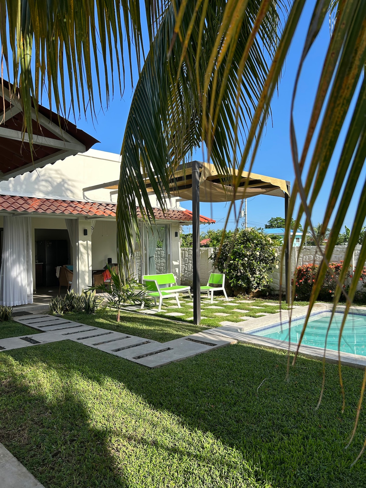 Rancho pet friendly a 3 minutos caminando a la playa San Blas, en vehículo a solo 8 minutos de El Tunco, 10 de El Zonte, 15 de Sunset Park y 3 minutos del centro comercial El Encuentro, zona segura, casa acogedora, con piscina, aire acondicionado en las 3 habitaciones, cocina equipada, parqueo privado. Horario ingreso desde las 9 a.m. y salida 2 p.m. (+ de 24 horas para tu estadía). Perfecta para familias y amigos, para disfrutar playas, surf, gastronomía y entretenimiento de la zona.