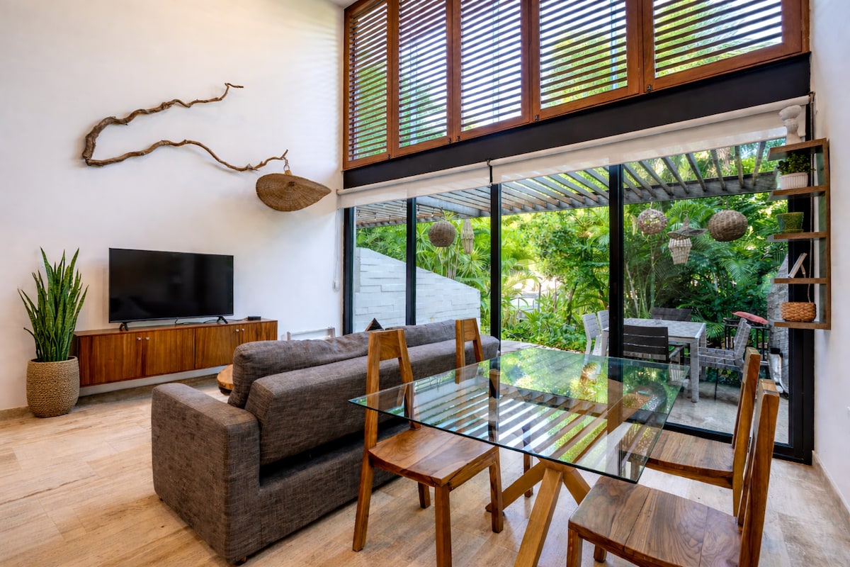 Welcome to our stunning one-bedroom condo in the heart of paradise! Nestled in a tropical haven close to the Caribbean, our Airbnb offers the perfect blend of relaxation and luxury. Our one-bedroom condo is designed for your utmost comfort and enjoyment. The bedroom features a king-sized bed with premium linens to ensure a restful night's sleep. Wake up to the gentle sound of jungle trees swaying in the breeze. Enjoy the covered outdoor deck under any weather, an unique feature of this condo.