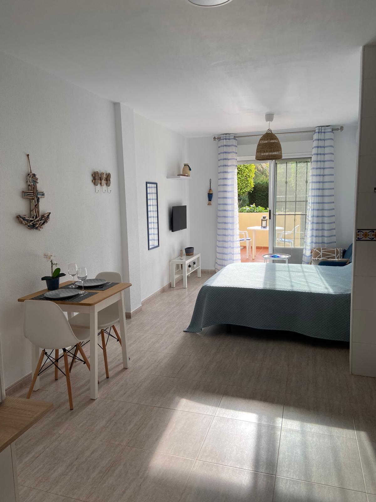 APARTAMENTO EN PLANTA BAJA EN ZONA NATURISTA TOTALMENTE REFORMADO. Dispone de un 1 dormitorio,baño,cocina totalmente equitada,salon con sofa cama, la vivienda tiene aproximadamente unos 45 m2 con una terraza de 12 m2 con acceso a zonas ajardinadas y piscina comunitaria. Situado a 1 minuto de la playa a pie. Dispone de parking privado. Esta situado cerca de parada de bus supermercados,farmacias,restaurantes y cerca del parque acuatico de vera y proximo a entornos naturales.