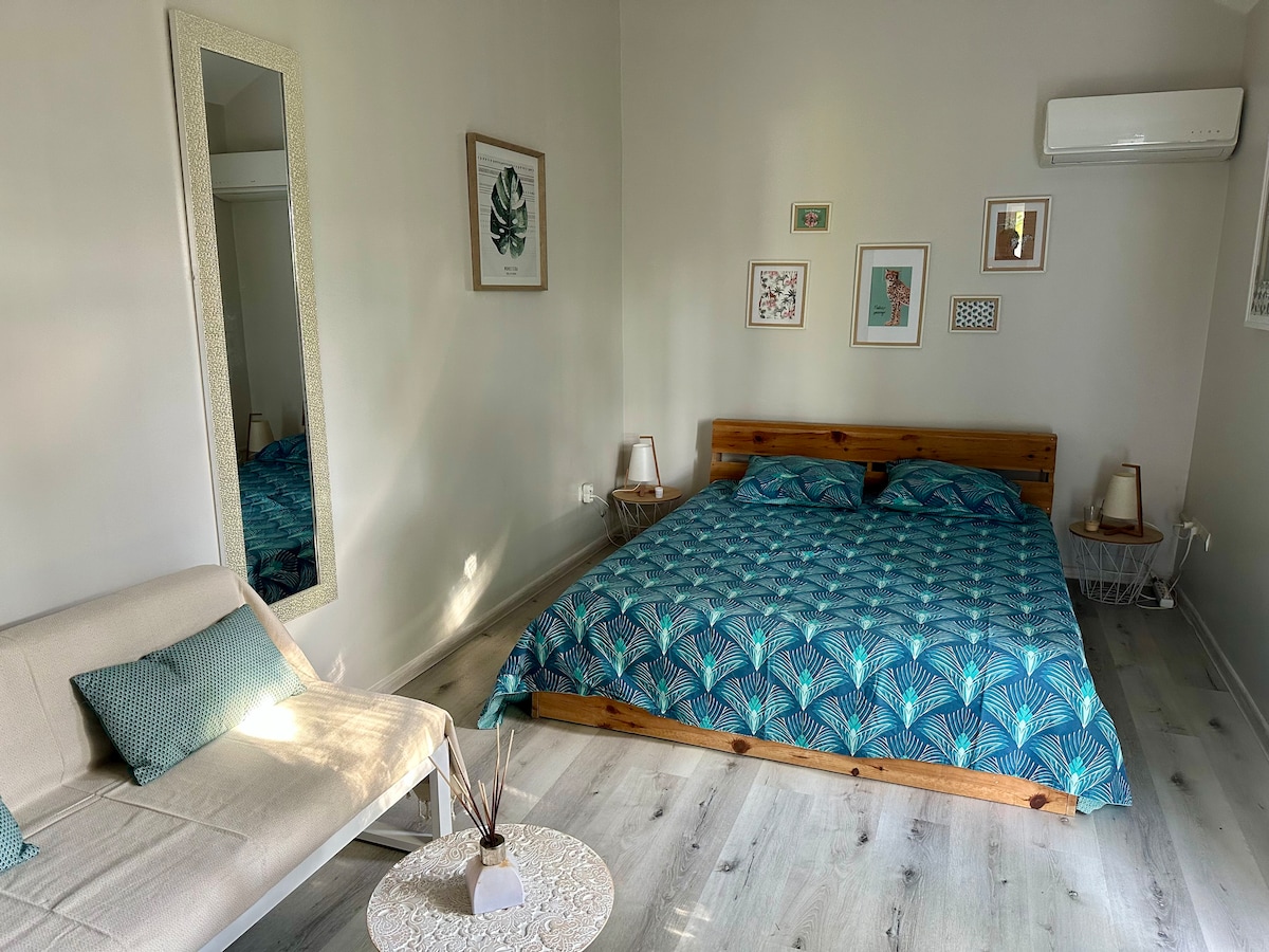 estudio «ti'closerie»: •Una habitación con cama de 160 con aire acondicionado (+ventilador de techo) •un baño completo •un vestidor • Televisor •Cocina americana totalmente equipada •una terraza cubierta en el jardín, sin vecinos, con zona de comedor y descanso (sillones de jardín) •una zona de descanso con tumbona y sombrilla •aparcamiento •barbacoa Se le enviará por correo electrónico una descripción detallada de la vivienda y su entorno en las semanas previas a su llegada, o a petición suya.
