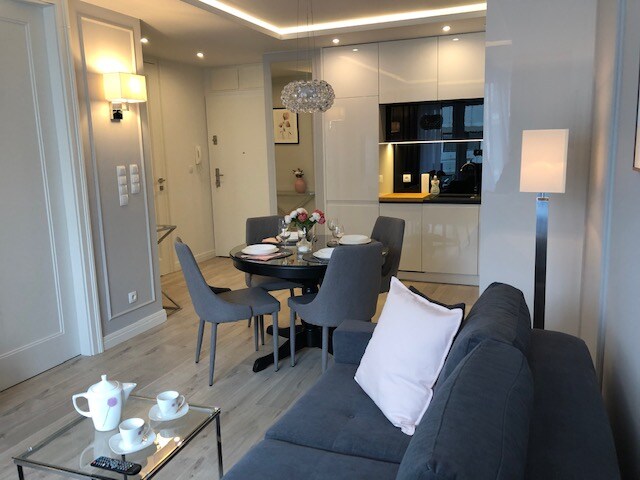 Elegante y moderno apartamento en el edificio de apartamentos Baltic Marina Residence de nueva construcción diseñado para 4 personas. Aproximadamente 36m2 consta de un dormitorio cerrado con una cama matrimonial de 140x200cm, una sala de estar con sofá convertible, un lugar para comer, una cocina americana totalmente equipada y un baño con ducha. Hay una salida al balcón desde el departamento.