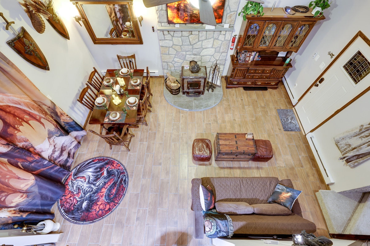 ¡Crea recuerdos mágicos en esta casa con temática de dragones! Reúne a tus amigos, incluidos los peludos, crea una escapada a la Feria Renacentista o una estancia romántica real. ¡Juega al minigolf: 3 tees pitch & putt justo en la propiedad! Acurrúcate junto a la hoguera o reúnete alrededor de una chimenea de leña. Sumérgete en una bañera de hidromasaje interior para dos mientras miras una chimenea de pared en la guarida del dragón o relájate en un jacuzzi al aire libre para cuatro; observa un jardín de piedra desde la cámara real o quédate en el dormitorio del bosque encantado.