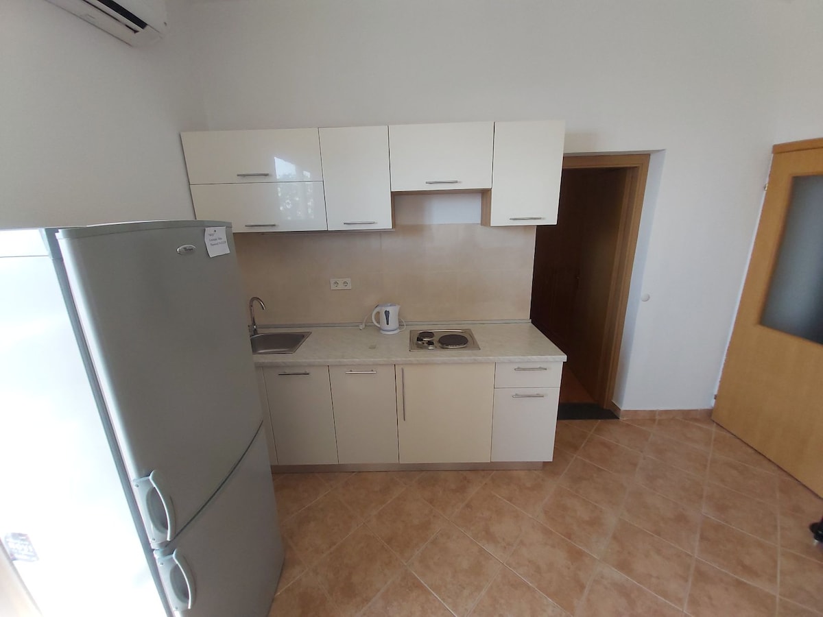 Apartamento tipo estudio para 2 + 2 personas. Una cama de matrimonio (160x200) y sofá cama (160x200). El departamento se ubica en una casa privada en primera fila del mar. Cerca hay varios restaurantes y tiendas. La panadería se encuentra a 30 metros del departamento. Estacionamiento privado gratuito, wifi gratuita con buena señal en toda la casa.