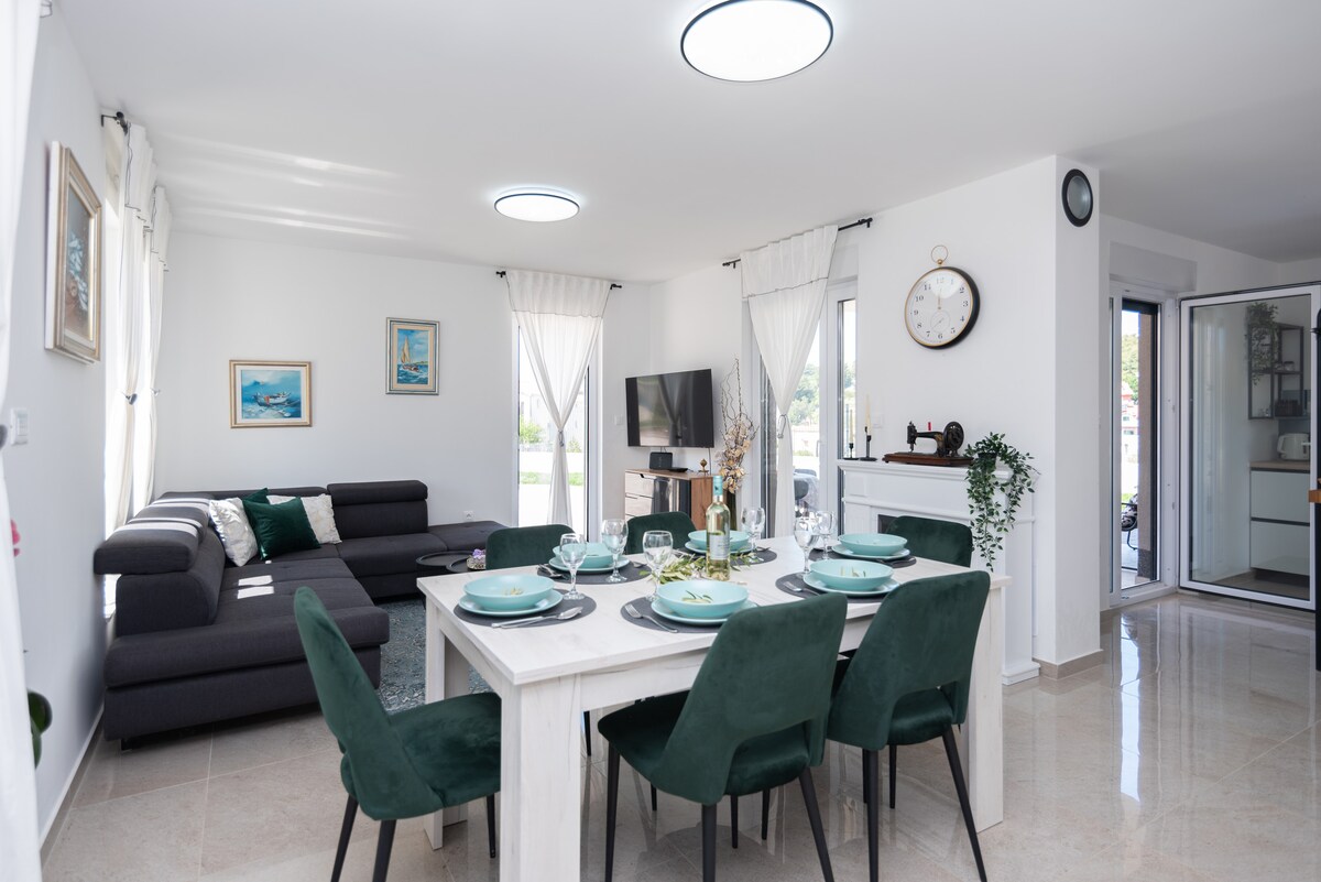 Nuevo apartamento estudio de 3* (26m2) ideal para parejas o viajeros en solitario con cocina,wifi,aire acondicionado,estacionamiento y barbacoa en casa de jardín. La primera playa está a 200 metros. En la excelente ubicación para nadar y disfrutar del sol y el mar (la playa tiene una bandera blanca por la calidad del mar). Justo hasta <10 minutos en coche del centro (Palacio de Diocleciano, museo de Juego de tronos), 4 minutos a pie de la riviera de Stobreč. La playa es de guijarros y espaciosa. Apartamento han cubierto gran terraza (35m2) con hermosa vista al jardín.