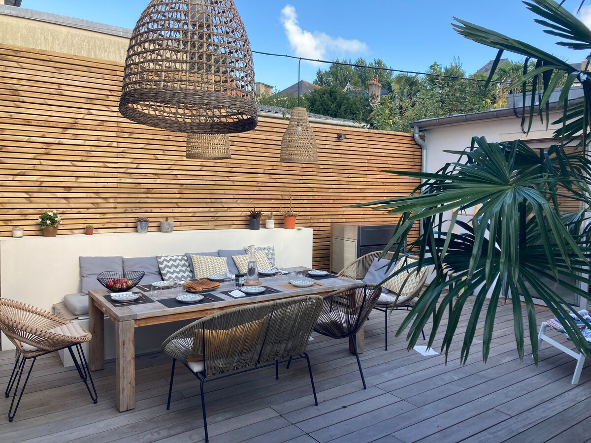 Dinard, cerca de Saint Malo . Venga a disfrutar en pareja, en familia o con amigos de una casa decorada con buen gusto. Cálida, le ofrece un confort óptimo en un entorno tranquilo. Su terraza le sumergirá en sus vacaciones desde el momento de su llegada... Alquiler por semanas durante las vacaciones escolares y mínimo de 2 noches fuera del período de vacaciones. Acceso a la playa por carril bici.