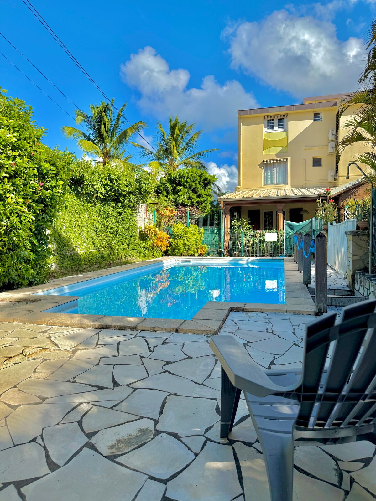 Encanto y comodidad con vistas a la ensenada de Mitan. Entre el pueblo criollo y el mar, el apartamento Tropicool tiene capacidad para 6/7 personas con sus tres habitaciones con aire acondicionado, incluida una suite principal, su cocina super equipada, su gran terraza y su zona de relajación en el altillo - 150 m2 de felicidad... dentro de una residencia segura, con acceso peatonal directo al mar... También dispondrá de un garaje, que le evitará cualquier problema de aparcamiento en esta zona tan popular...