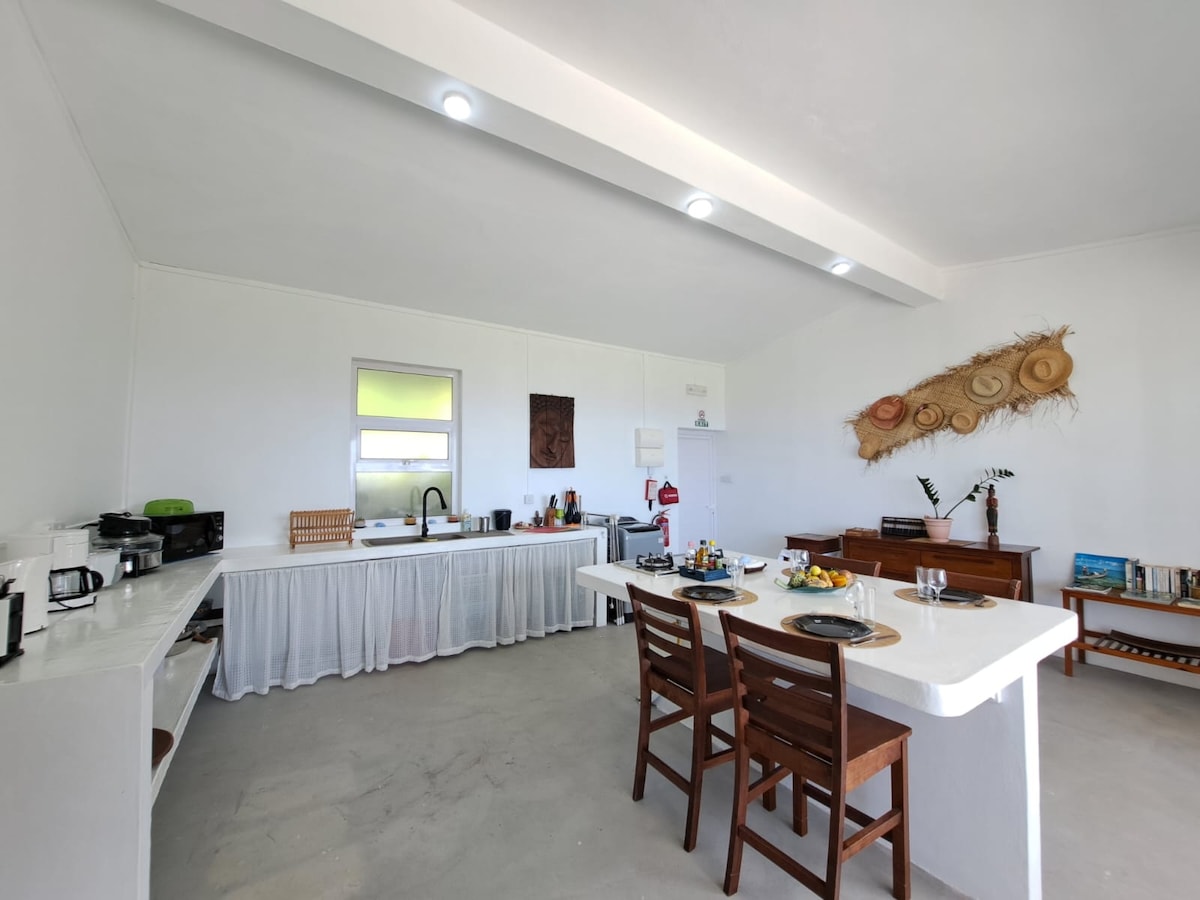petite maison de tôle rouge typique de l ile Rodrigues..qui surplombe la mer avec vue magnifique sur le lagon, proche de la plage avec toutes activités. accessibilité facile, commerces à proximité . petit déjeuner et déjeuner possible moyennant 450rs par personne pour le dejeuner et 250rs par personne pour le petit dejeuner scooter disponible sur place a la location 600rs par jour transfert aeroport compris