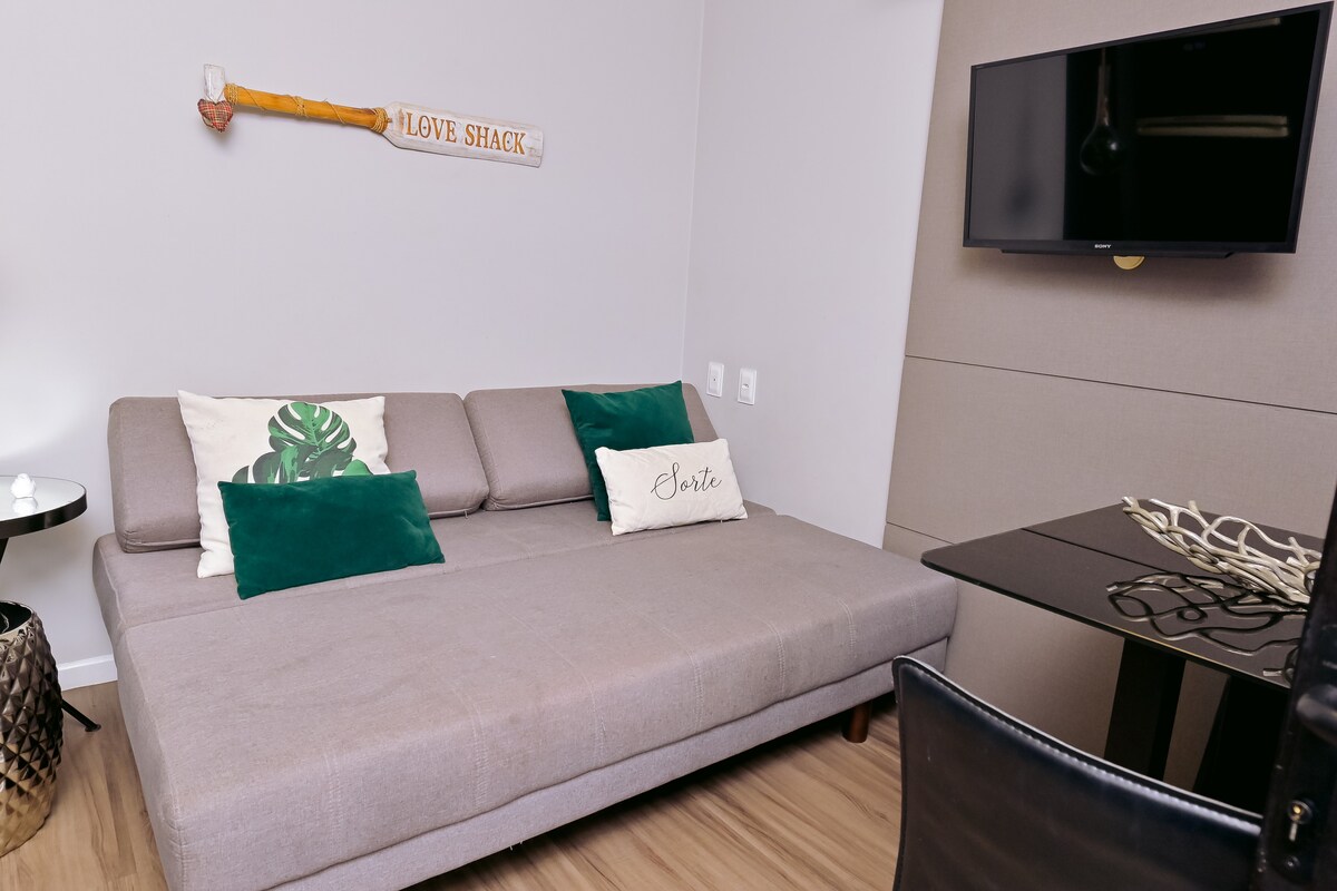 Los servicios de lujo y de 5 estrellas cuentan con este apartamento de 2 habitaciones. Un espacio panorámico con jardín con el complejo de piscinas más grande de Florianópolis . Disfruta de las vistas del jardín residencial a 50 metros de altura del nivel del mar. Siéntete como en casa con todo lo que necesitas o relájate en la piscina cubierta climatizada del residencial. Sin mencionar la famosa playa con arena blanca y aguas transparentes. South English.