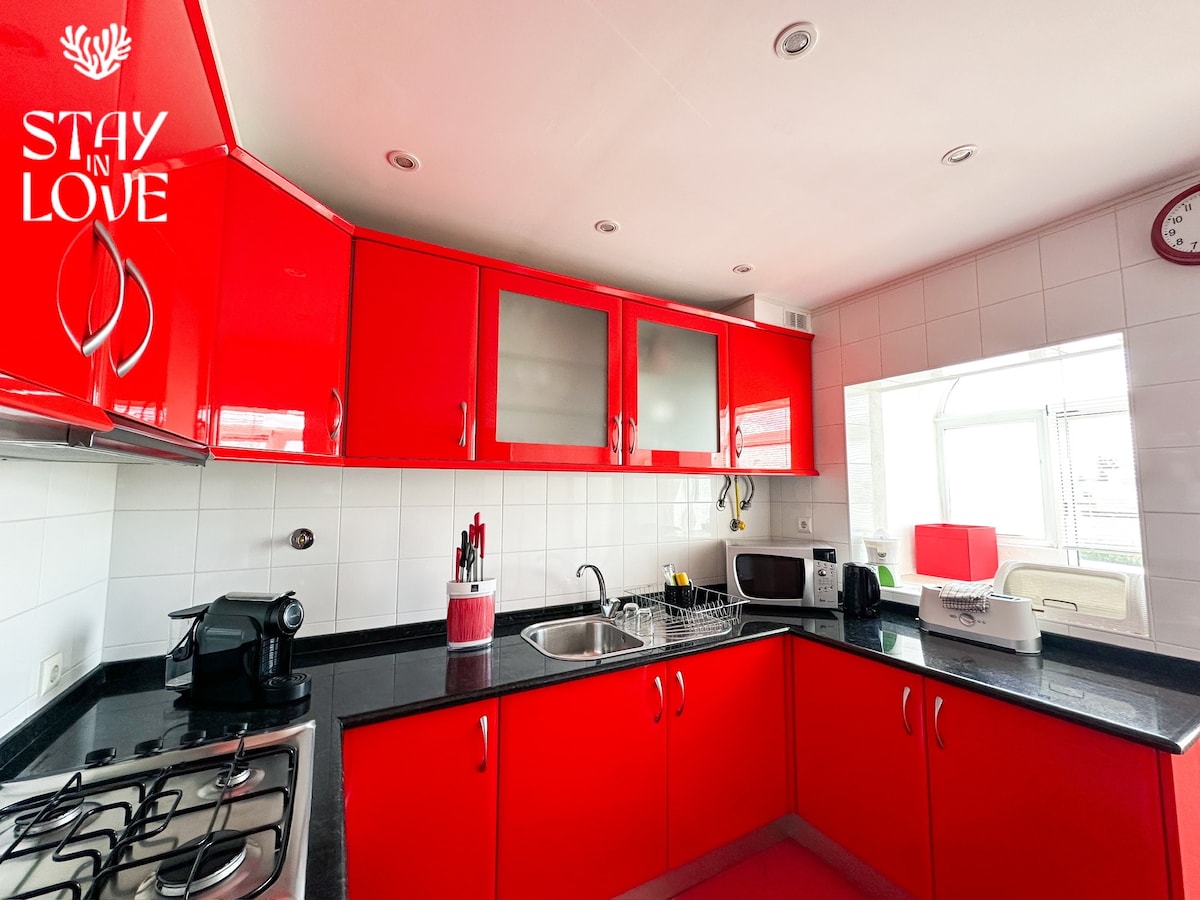 Apartamento de dos dormitorios y dos baños en el centro de Carvoeiro, en la tercera planta con ascensor. Capacidad para 4 personas, tiene cocina, combo lavadora/secadora, comedor, salón con TV de pantalla grande con Netflix y Amazon. Ambos dormitorios se pueden hacer con (1) cama tamaño king o 2 camas individuales, acceso al balcón, ventiladores de techo y armarios grandes. El principal es en suite, el segundo baño está en el pasillo. Wifi, cuna portátil y trona. Balcón privado. Aparcamiento privado en el edificio. A 4 minutos a pie de la playa.