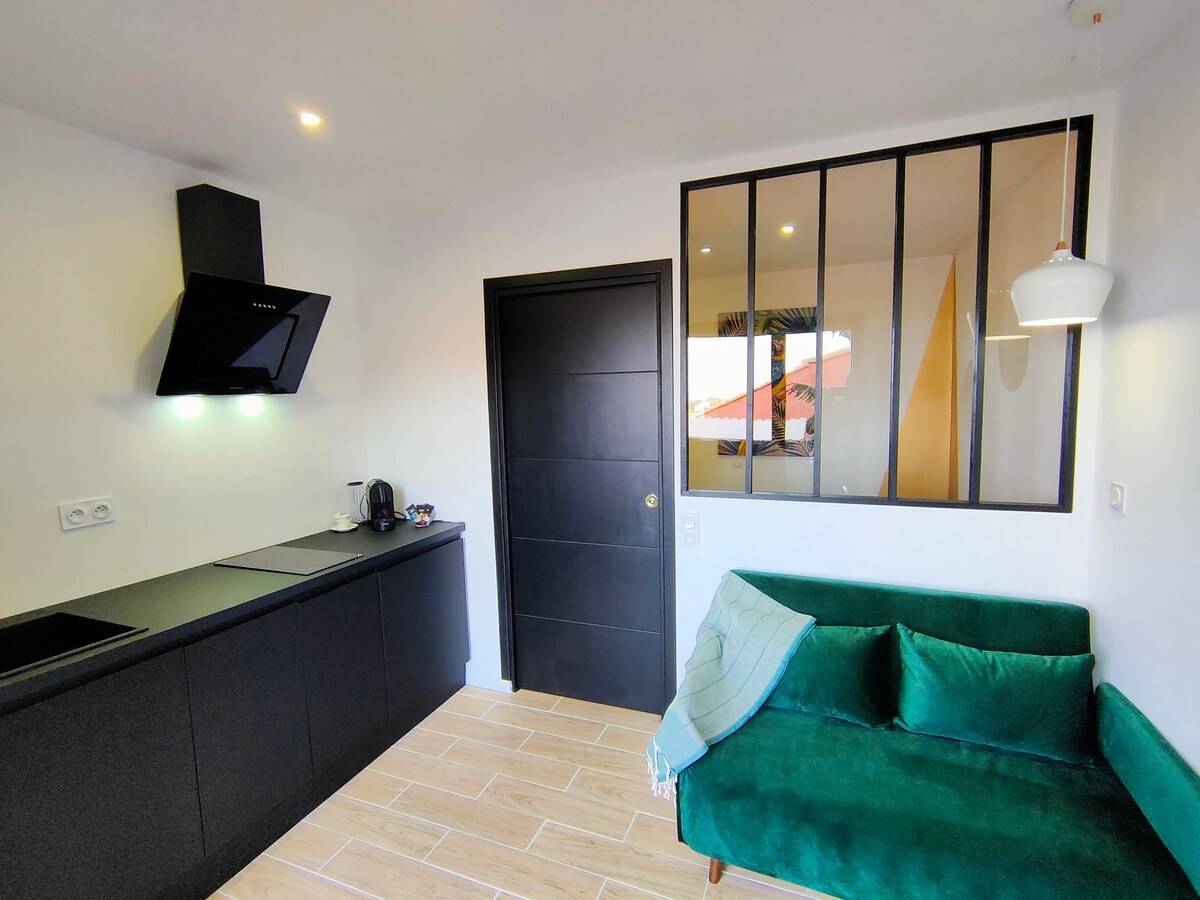 Logement 27m2, en Rez de jardin. Séjour avec 1 convertible 160 x 200cm et 1 chambre climatisée, avec un lit 160 x 200cms. Salle de bain, douche italienne, wc. Barbecue sur un jardin terrasse, le tout réservé exclusivement aux voyageurs. Le linge de lit est fourni: Draps, taies d'oreillers et couettes. Serviettes, Torchons. Gel douche . Et pour la cuisine: Sel, poivre, sucre, thé. Cafetière filtre + cafetière Tassimo. 2 cafetières.
