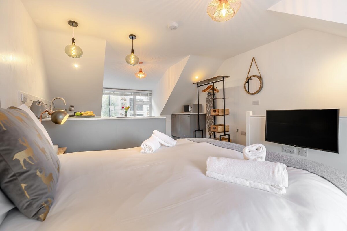 Este lujoso apartamento estudio tiene algunas de las vistas más impresionantes del puerto, la bahía y las playas de St. Ives. Situado en uno de los edificios más antiguos de St. Ives en el corazón de St. Ives, este moderno apartamento fue diseñado para mantener algunas características del edificio original, mientras disfruta de la mayoría de las impresionantes vistas, ya sea descansando en el sofá, comiendo en la barra de desayuno o acostado en la cómoda cama.