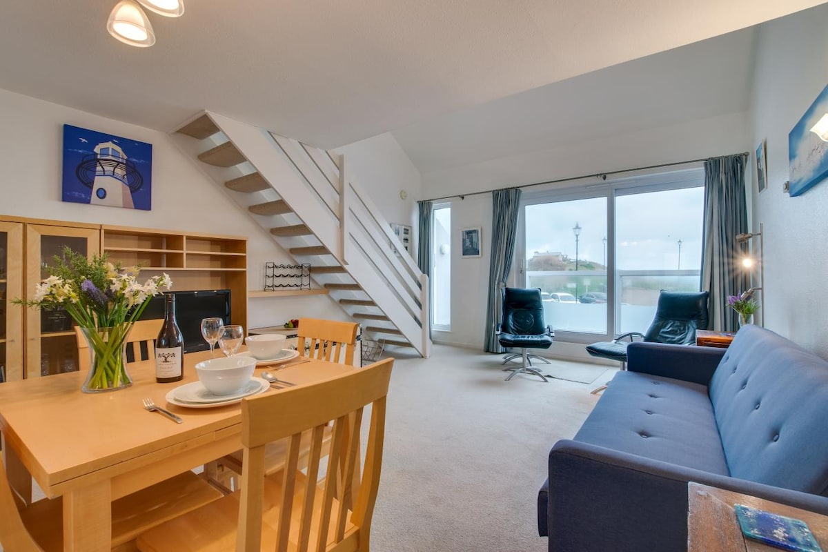 6 Sunnyside, ático con vistas espectaculares al mar en primera línea de The Wharf, St Ives. Posición frente al puerto. Wifi gratuito.