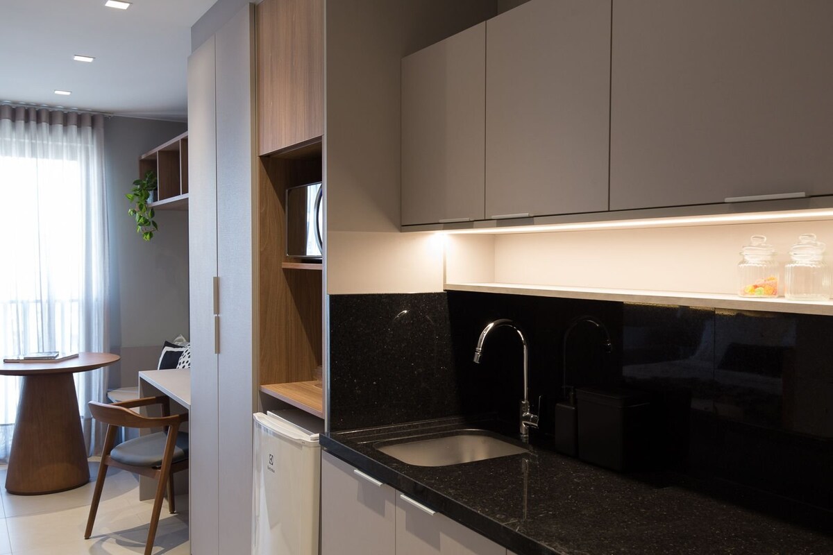 Moderno y acogedor estudio, decorado por un arquitecto, en un piso alto, con una amplia vista de la ciudad, en una zona segura y tranquila. Ideal para trabajo o placer, cuenta con Wi-Fi rápido, Smart TV, cama tamaño queen con persianas, sofá cama, aire acondicionado, armarios y cocina funcional con minibar dúplex. Baño con toallero térmico, ducha potente y secador de pelo. Edificio con gimnasio abierto las 24 horas, piscina termal, azotea y lavandería. A 850 m de Parcão.
