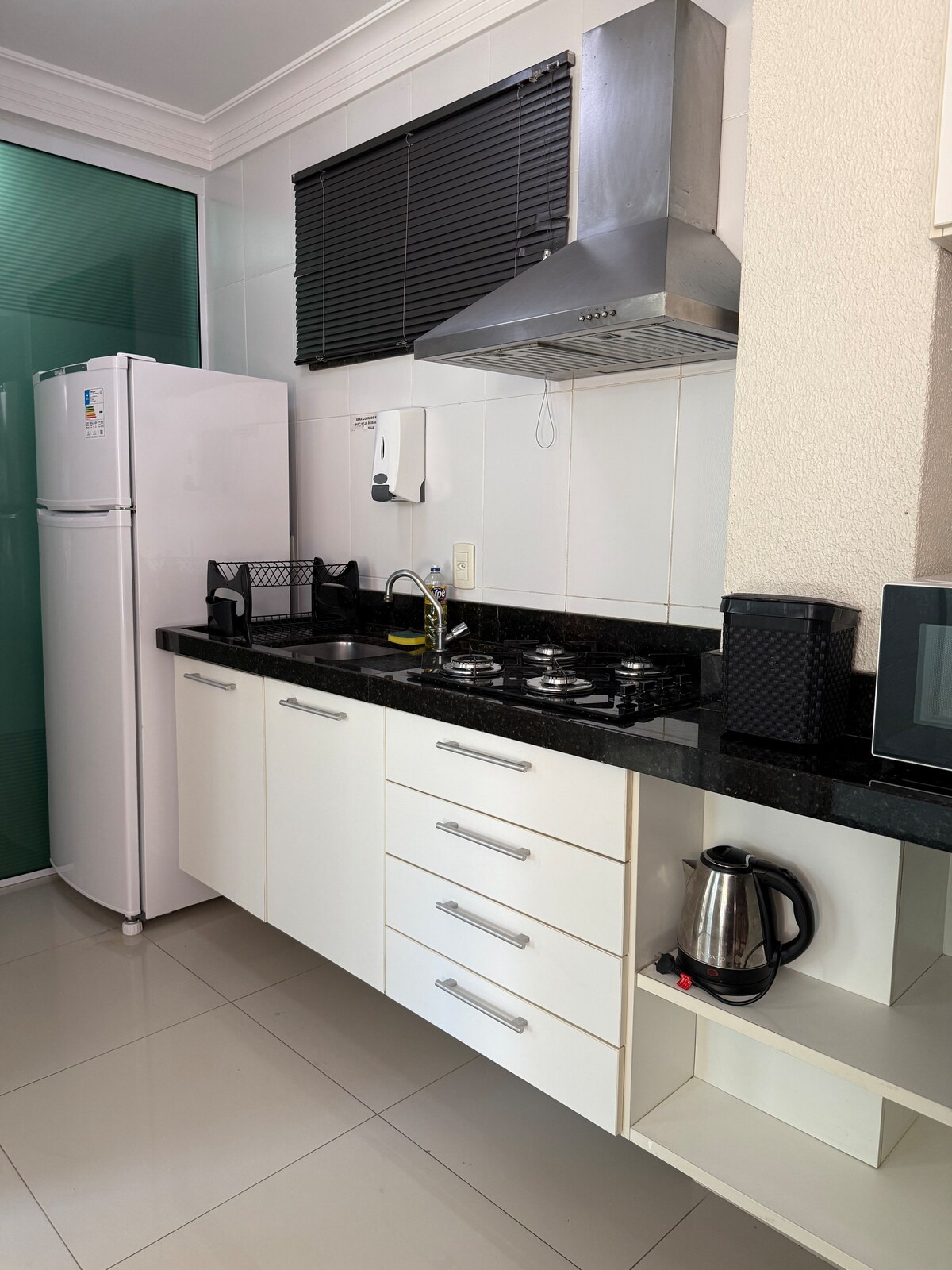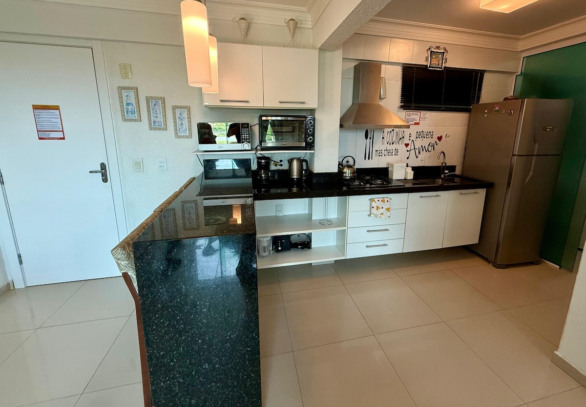 Apartamento completo para una estancia increíble, contiene balcón con parrilla, internet de fibra óptica, aire acondicionado frío/calor, cocina completa con electrodomésticos como horno eléctrico, microondas, licuadora, sandwichera y cafetera. Se pueden utilizar las áreas comunes del condominio, como piscina al aire libre y piscina climatizada, sala de juegos, sauna y gimnasio . El departamento está cerca del comercio local y a 450 metros de la playa de Bombas. 1 estacionamiento dentro del condominio.