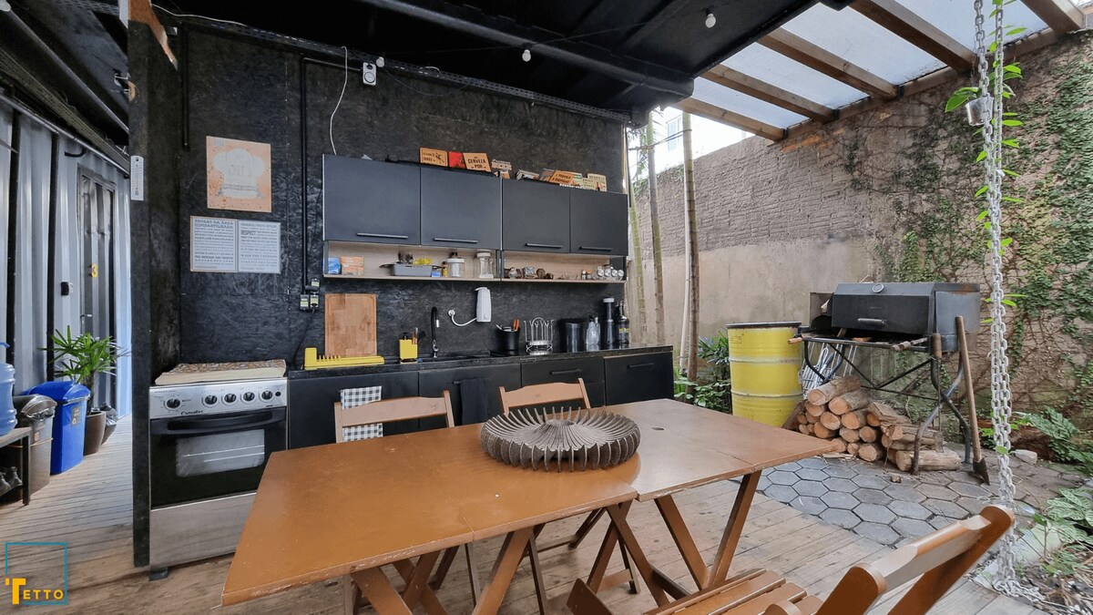 Rodéate de estilo en esta acogedora suite a 350 m de la playa. Suite PRIVADA con acceso independiente en una casa construida con contenedores de marítimos reciclados. *Mascotas: No permitidas en esta unidad. Si necesitas traer a tu mascota, consulta nuestras unidades T1 (mini-apartamento1-container-em-itapema-sc) ou T2 (mini-apartamento2-container-em-itapema-sc).