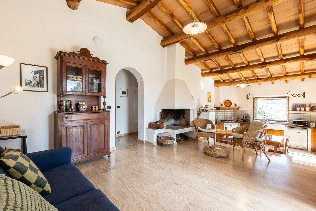 Una amplia sala de estar con vistas a un gran jardín con porche, te permitirá acceder a los dos pisos diferentes de la casa. Subimos por la escalera hasta llegar a un baño con ducha y las entradas de dos habitaciones dobles, una de las cuales con la adición de una litera. Volviendo al ambiente principal con funciones de sala de estar/comedor/cocina, bajamos una rampa de escaleras y llegamos a una taberna que da a un porche donde hay un horno de leña de piedra.