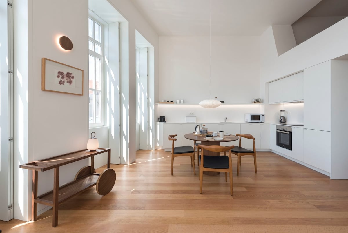 Located on the second floor, this apartment hosts four guests and features air conditioning, a washer, a meditation room/mini gym and a balcony facing Rua Santa Catarina. The lower-floor bedroom opens to the living room via a pocket door. Near Bolhão Market, Aliados and the Douro River. For guests traveling with little ones, a baby pack is available on request (€25) and includes a cot with linen, high chair, bathtub, baby amenities, and a baby towel.