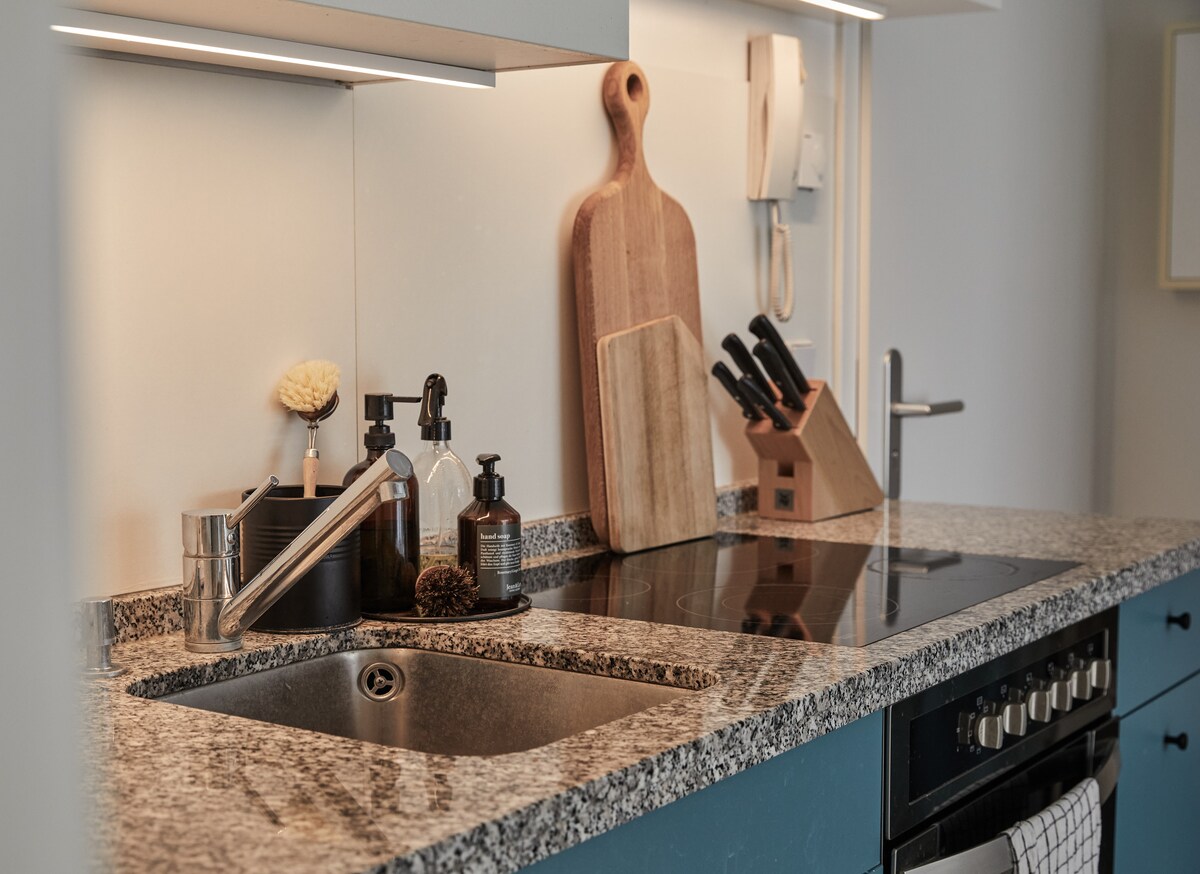 - Estudio con 21 metros cuadrados /226 pies cuadrados de espacio. - Ideal para un máximo de 2 personas - Cama doble (160x200 cm / 63x79in) - Baño moderno con ducha. - Cocina pequeña totalmente equipada con artículos básicos para hacer té y café y una mesa de comedor. Ten en cuenta que la habitación real puede diferir de las fotos.