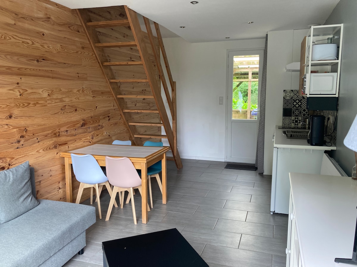 Gîte avec accès indépendant avec 2 chambres, terrasse, jardin, parking. Le RDC est composé d’une cuisine équipée, d’un espace repas , d’un canapé lit et une grande terrasse avec vue sur la nature et le jardin avec tables, chaises longues, barbecue et une 2éme terrasse avec fauteuils de jardin. L’étage est constitué d’une chambre avec deux lits de 90x200, d’une chambre avec un lit de 140x190, d’une salle de bain (douche neuve installée mi-octobre 2025) et d’un WC séparés
