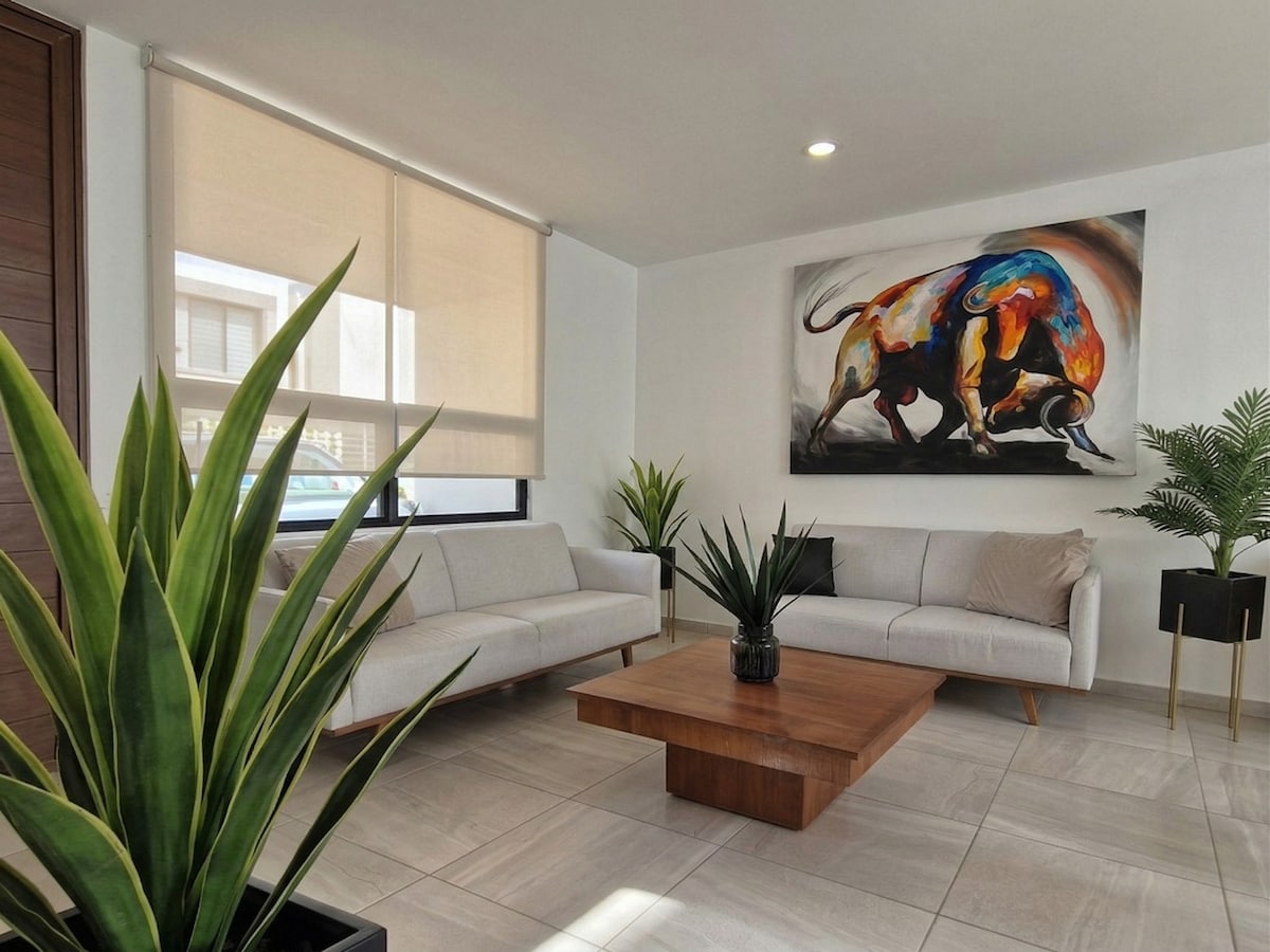 Casa de 3 habitaciones, 2 baños y vestidor, céntrica, a unos cuántos pasos del Parque Tangamanga, Plaza Tangamanga y Plaza Citadela. Cerca tiendas de autoservicio, cajeros. Pantalla 65 pulgadas, elíptica, totalmente equipada para estancias largas o fines de semana, cocina integral amplia y equipada, patio de servicio, y cochera para un auto mediano