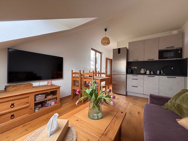 Hermoso apartamento en el ático con una gran terraza y vistas a la naturaleza. El apartamento es espacioso, adecuado para 2 personas o una familia con uno o dos niños. Está cómodamente equipado. Los huéspedes tienen a su disposición un aparcamiento reservado y un compartimento con cerradura para bicicletas, esquís o cochecitos.