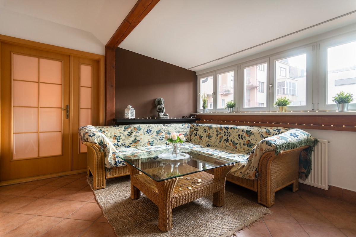 Finalista del concurso TOP Modern-Classic Design 2023. Alójate en el apartamento más elegante que hayas visto nunca. Nota: NO es un apartamento para FIESTAS. La mejor ubicación: - A 2 minutos del Museo Nacional y la plaza Wenceslao. - A 3 minutos de la estación principal de trenes. - A 1 minuto del parque Riegrovy sady, el más bonito. El equipamiento - Ver películas en calidad de cine en casa: pantalla gigante. - Relájate en la sauna infrarroja. El diseño - Elementos y muebles cuidadosamente seleccionados que subrayan el estilo histórico.