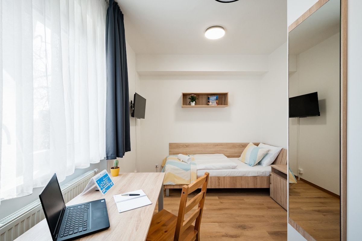 Apartamento tipo estudio moderno, acogedor y súper limpio de fácil acceso al casco antiguo de Praga (15 minutos). Llegada autónoma (a partir de las 5:00 p. m. o antes según la solicitud). WIFI (50 Mb/s), NETFLIX, café y té de forma gratuita. A 5 minutos a pie de la estación de tranvía (a continuación, a 15 minutos del centro antiguo). A 10 minutos a pie de la estación de metro (a continuación, a 4 minutos del centro antiguo). 1 doble malo (200 cm x 160 cm), cocina equipada. 1 baño con esquina de ducha, inodoro,lavadora (secador de pelo).