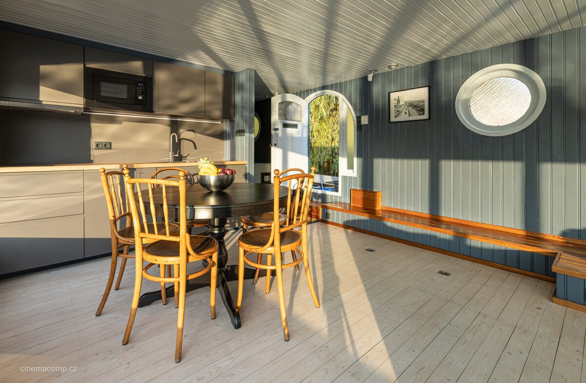 Stay on the water and experience Prague from a completely different perspective. Guests love the peaceful atmosphere, beautiful river views, and the cozy, bright interior that makes you feel instantly at home. Size 11x3,2 m. The whole ground floor has heated floor and can be heated up with A/C unit + fireplace.
