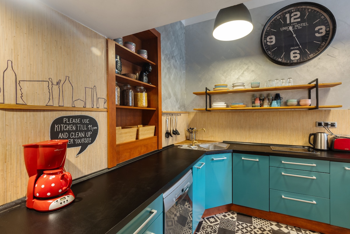 Te ofrecemos una bonita habitación en el hostal. Además de tu habitación, tendrás acceso a nuestra sala común donde podrás socializar con otros huéspedes, cocina totalmente equipada (platos, vasos, sartenes, cocina, nevera, microondas, etc.), computadoras con acceso a internet, 2 terrazas con parrilla (carbón disponible de forma gratuita). Hay muchos baños limpios disponibles todo el tiempo. ¡Café y té GRATIS las 24 horas!
