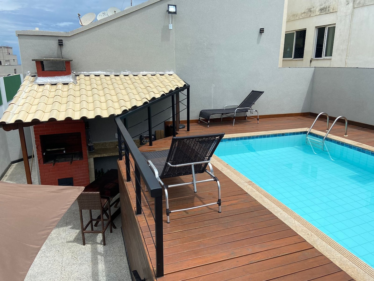 Loft de 02 dormitorios, con toda la estructura de hotel, piscina, salón de fiestas, barbacoa, dormitorios con aire acondicionado, cocina con estufa, nevera, cafetera, filtro de agua, dormitorio con cama Queen y el otro con cama individual. Wifi privado de 360 megas Sala con TV, sofá y todas las comodidades que te mereces. En el centro de Guarapari. Al lado hay panadería, restaurantes, a pocos pasos de la playa.