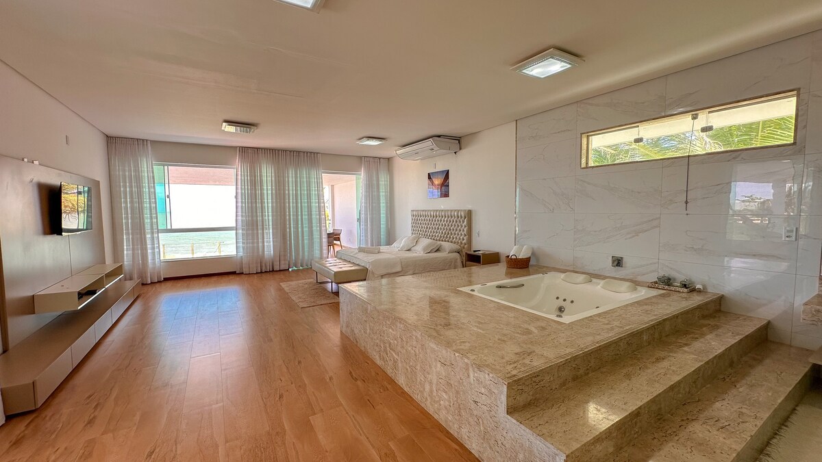 Un oasis de tranquilidad frente al mar, una escalera en el acantilado te lleva a una playa de aguas cálidas. Maravillosa y acogedora casa con piscina, 5 suites con aire acondicionado split, cocina equipada, balcones, cancha de arena iluminada e Internet óptimo Ideal para familias y amigos, descanso, confraternizaciones, fiestas y pequeños eventos. Tenemos otro chalet con 2 suites y otra suite, separadas, manteniendo la privacidad de todos si su grupo tiene más de 16 personas y quiere más comodidad