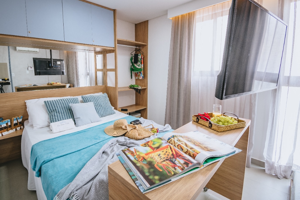 Acogedor apartamento, con cocina abierta, sala de estar con sofá cama, aire acondicionado, TV inteligente, balcón y un dormitorio con cama doble, aire acondicionado y armario. Cocina con todos los utensilios, microondas, licuadora, sandwichera, nevera, cafetera, vajilla y freidora de aire. Enxoval Ducha con calefacción de gas Wi-Fi Zona de ocio en la azotea con espejo de agua, vistas al mar, piscina para adultos y niños al atardecer Maraca Beach II está a 50 m de la playa, con ascensor, conserje 24 horas y acceso también por Beira Mar