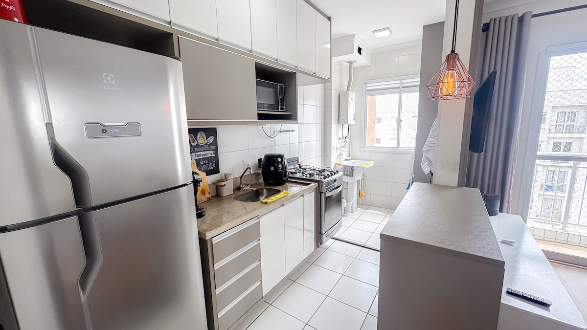Apto. luminoso, todo en porcelana y bien ventilado. Hay 2 dormitorios, una suite y otro dormitorio con 3 camas individuales. También tengo un sofá cama en la sala de estar que tiene capacidad para 2 personas, pero pierde comodidad debido al sofá abierto en la sala de estar, pero puedo alojar hasta 7 personas. Ofrecemos dos televisores, espejos grandes, ventiladores, estufa, microondas, cafetera, termo, grifo con filtro, refrigerador, licuadora, olla arrocera eléctrica, olla a presión, aspiradora, refrigerador.