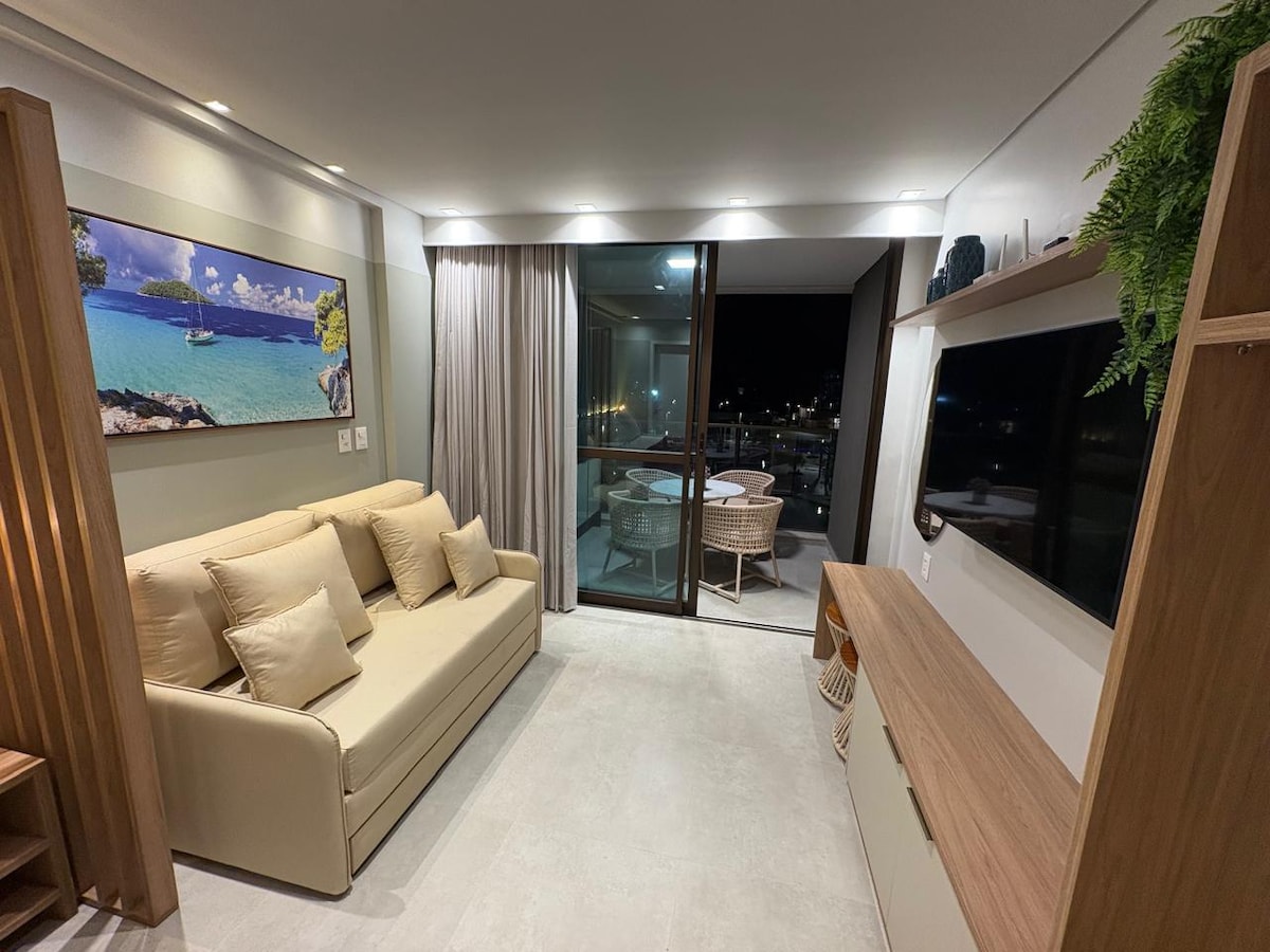 Apartamento de alta gama en Muro Alto, Porto de Galinhas, ideal para hasta 4 personas. Totalmente amueblado, ofrece una sala de estar con TV y sofá cama, 1 dormitorio con una cama doble, cocina completa (microondas, cafetera, fogones y utensilios), wifi, aire acondicionado y ropa de cama completa. Balcón con vistas a la piscina, en un condominio resort con acceso directo a la playa, ocio y seguridad para su estancia.