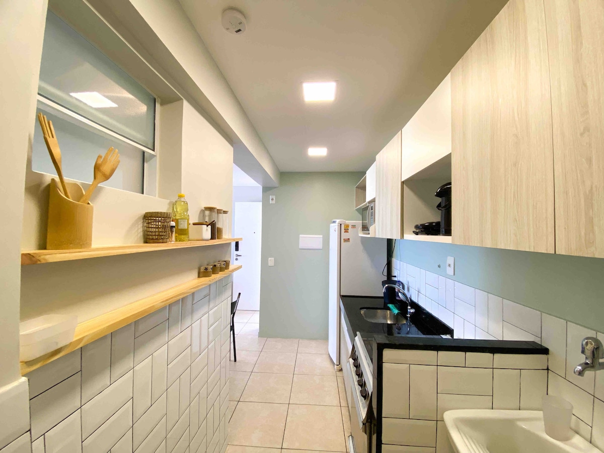 ¡Un lugar tranquilo y silencioso! Ideal para parejas. A unas 5 manzanas de la popular Praia do Futuro. Apartamento de 35 m², dormitorio amueblado con aire acondicionado Split de 12 000 BTU, Smart TV de 32 pulgadas con Netflix, cama doble, sofá, armario, mesa, sillas, cocina, nevera, microondas, Airfryer, cafetera eléctrica, licuadora, sandwichera, tostadora, platos, vaso, ollas, cubiertos. Baño con ducha y ducha caliente. Wi-Fi y estacionamiento seguro con puerta automática, valla eléctrica, concertina.
