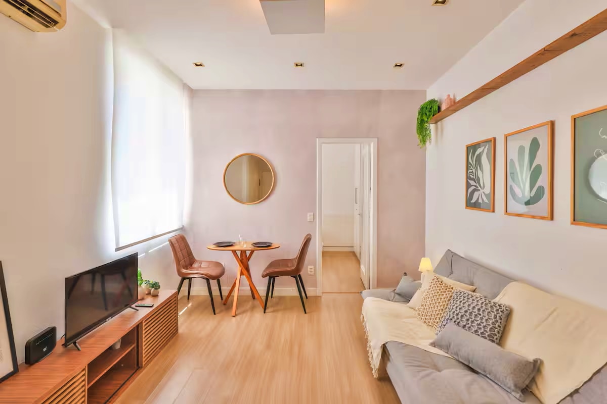 Stay in a space tested and approved by several guests! Beautifully decorated, spacious apartment (45m²), quiet (back). Separate bedroom and living room, with air conditioning in both areas. Equipped kitchen. Unbeatable location - Just 150m from Copacabana Beach - 500m from Arpoador Beach - 600m from Ipanema Beach - Next to Copacabana Fort and the famous Arpoador sunset - Surrounded by bars, restaurants, markets and all kinds of shops Satisfaction guaranteed. Book now.