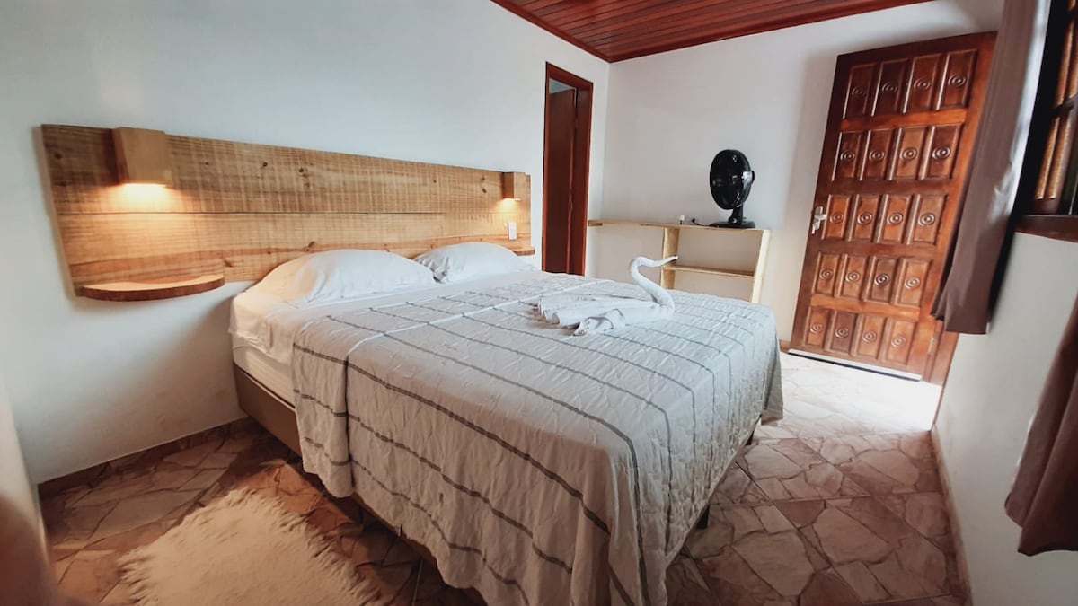 Temos uma casinha simples e bem localizada na Praia de Encantadas. Contendo quarto com televisão e ar-condicionado + banheiro comum + espaço para realizar as refeições (pia, fogão elétrico, geladeira e itens de cozinha). O terreno é privativo, está há 150mts do píer de embarque/desembarque e da praia principal; próximo a mercados, padaria, restaurantes e outros comércios. **Não fornecemos mantimentos e itens de uso pessoal como: toalhas de banho, sabonetes, creme dental, etc.