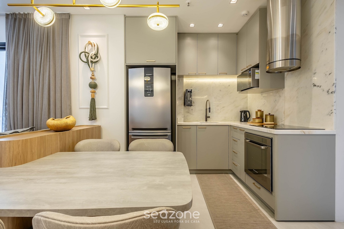 Este apartamento informal fue diseñado para que te sintieras relajado junto a los que amas,ya sea en la barbacoa en el balcón, viendo el mar a lo lejos o el movimiento en la calle. La sala de estar integrada,cocina y área de barbacoa son una invitación para que todos estén juntos. ¡Las piscinas con aire acondicionado para adultos y niños te esperan! Vc.pay puedes usar la Academia y el jacuzzi. Para llegar a la playa, solo camina una cuadra, con el carrito, las sillas y el protector solar que están disponibles. Vc. tendrá todo a mano y ni siquiera es necesario usar el auto.