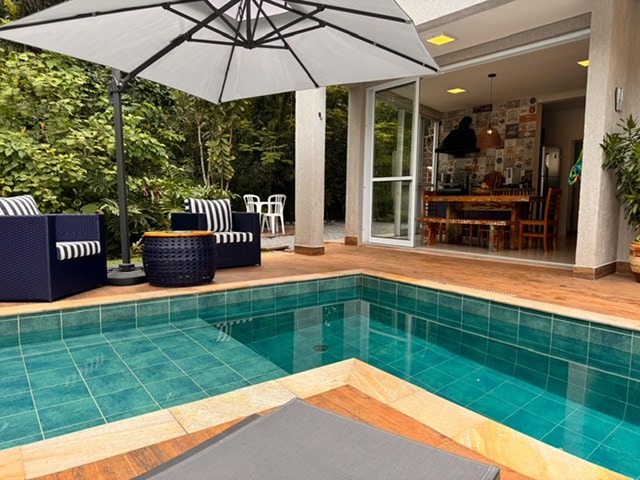 Casa dois andares com infraestrutura completa, apenas 2 minutos a pé da praia. 4 suites com ar condicionado( Uma no térreo ), wi-fi 500mg , Smartv,. Área externa contemplando piscina, Jacuzzi ,churrasqueira, forno de pizza, forno a lenha e mesa ao redor da natureza, redes, lareira na sala, caiaques. Condomínio seguro com reconhecimento facial, rondas 24hs, praia tranquila e vazia, rios. Cozinha completa,2 geladeiras com freezer, freezer na dispensa,máquina de lavar roupa, quartinho.