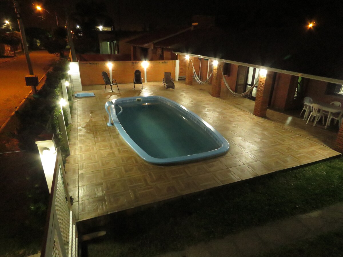 Lea las NORMAS DE LA CASA antes de reservar. Usted se compromete a cumplirlas al hacer la reserva. Casa con 3 dormitorios, 1 suite y 2 habitaciones dobles. Aire acondicionado en las habitaciones. Piscina, internet, parrilla exterior e interior, horno, microondas, lavavajillas, lavadora, calefacción central, gran patio, etc. La casa tiene capacidad para 6 personas. Ubicación: Barrio Atlántida - Ciudad de Shangri-La. Para fin de año, acepto al menos 10 días.
