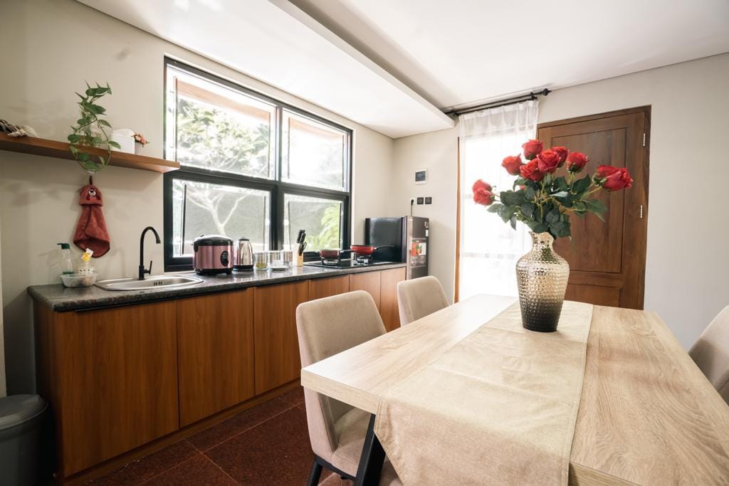 Nuestra villa fue recientemente renovada en marzo de 2022. Es natural, tropical y hogareña. En nuestra casa puedes encontrar: - 3 dormitorios con aire acondicionado - 2 baños con calentador de agua - 1 baño estándar - Cocina - Comedor - Sala de estar y rincón de libros - Aparcamiento (apto para 1 coche) - Jardín con cenador. - Balcón Nuestras normas de la casa: - Capacidad: 6 adultos. Por favor, sé honesto con respecto a este asunto. Queremos mantener la casa bien cuidada y que te sientas cómodo. - No se permiten fiestas ni reuniones. - No se admiten mascotas.