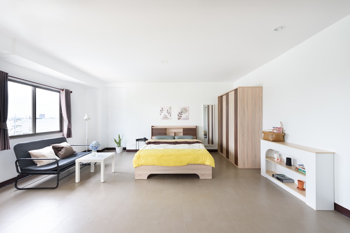 Relájate y desconecta en este alojamiento tranquilo y elegante al que puedes llegar directamente desde el aeropuerto de Suvarnabhumi y tener un fácil acceso al centro de la ciudad. - A 7 minutos a pie del tren elevado (estación de enlace del aeropuerto Ramkhamhaeng) que te conecta con cualquier lugar de Bangkok en BTS y MRT. - A 20-30 minutos en coche del aeropuerto de Suvarnabhumi. - Es fácil conseguir un autobús, taxi o bicitaxi. - Tienda 7/11 y una cafetería en el edificio, algo de comida callejera local cerca. - ¡Servicio de lavandería gratuito! (lavado, secado y doblado) - Servicios de seguridad las 24 horas y CCTV.