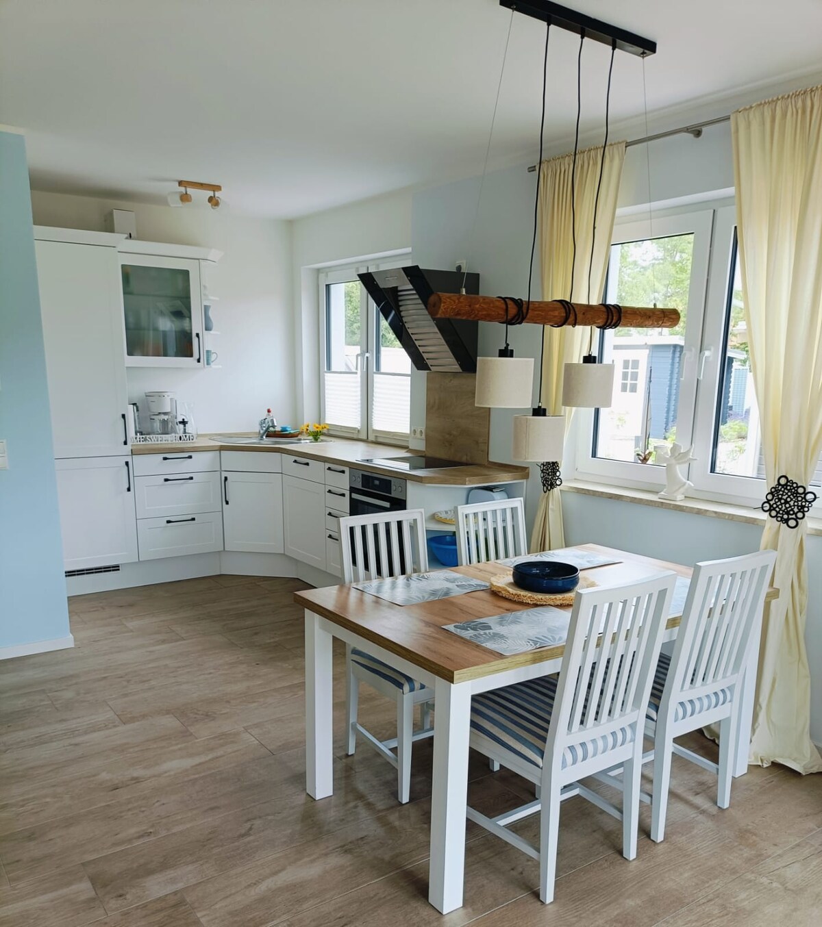 ... mira desde tu cama al agua, disfruta de la paz y la tranquilidad y escucha el susurro del bosque de hayas, experimenta recorridos en bicicleta directamente en el agua y disfruta de la naturaleza. Una hermosa, moderna y rústica casa de entramado de baja energía con tejado de paja, azulejos marroquíes, tablas de roble y paredes de yeso de arcilla te espera. Para las actividades hay un hermoso jardín grande con un columpio en el bosque, sauna de vapor gratuita, ducha y bañera al aire libre, una tabla de paddle surf, un barco de pedales y 4 bicicletas.