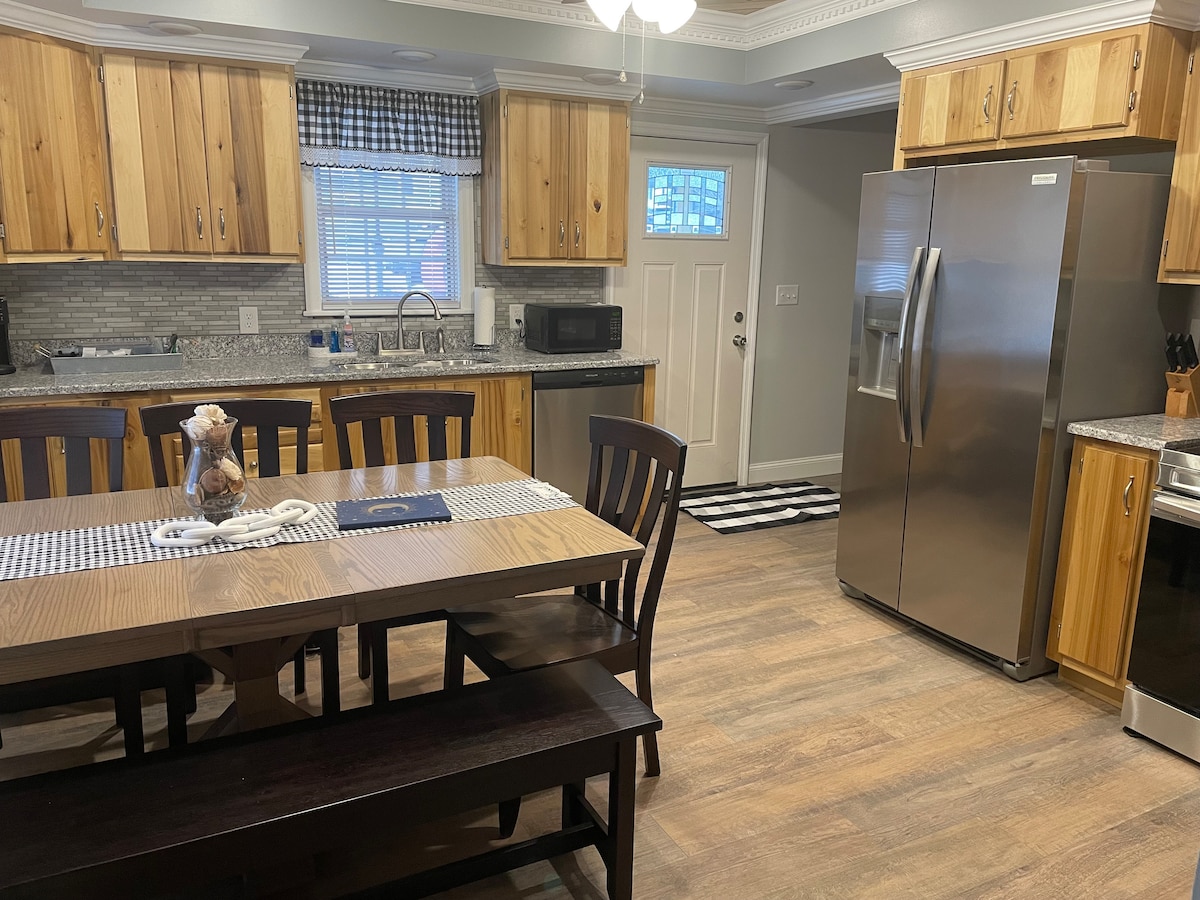 Relájate con toda la familia en este tranquilo escondite en la cima de una colina. Tan pronto como entres por la puerta, la alegre sala de estar te invita a sentarte y relajarte. El nivel principal de la casa es el espacio habitable principal con la planta abierta en la cocina, sala de estar y comedor que fomenta relajarse y socializar juntos. El patio trasero totalmente vallado es un excelente espacio para que los niños y las mascotas corran y jueguen. La acogedora chimenea situada en el bosque está situada con una gran vista de todo el patio.