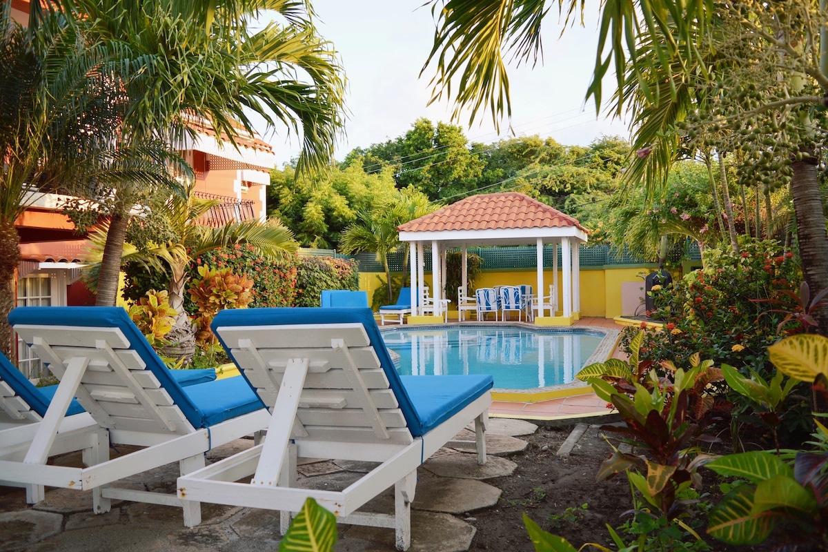 Turtleback Pavilion at Reef View Pavilions is a private, Spanish style, one bedroom suite with a private, sparkling blue swimming pool, an amazing rooftop pavilion & multiple, private outdoor areas offering Caribbean style living. Guests can lounge under the rooftop pavilion & on the sun tanning deck. The main level comprises of lovely, covered verandahs, bedroom & living room spaces, and a kitchenette designed in an open plan.