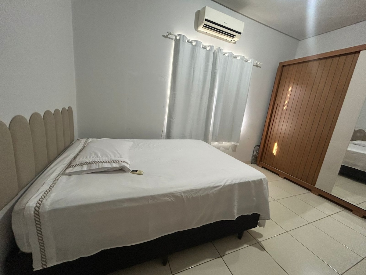 Relaxe neste lugar único e tranquilo. Próximo ao centro, supermercados e pista de caminhada em frente . Espaço para quem precisa descansar, possui cama de casal confortável com ar e wifi, TV. Possui cozinha com fogão, microondas, geladeira,etc