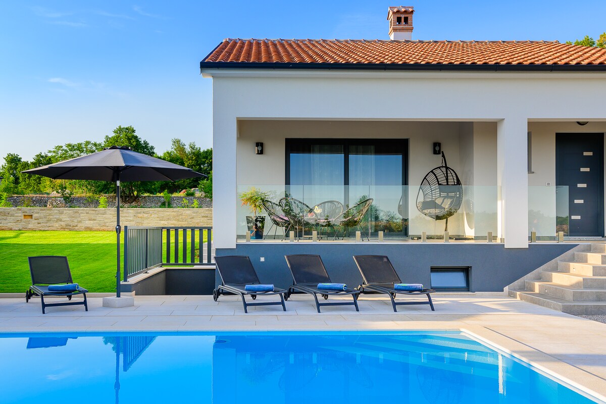 Stylish villa near Rovinj with picture worthy pool, sunk in hot tub, sauna. Wake up to lush, panoramic valley views. Couples and family-friendly, a short drive to adventure park, Brijuni National Park, dinopark, medieval towns & local cuisine. It is a true green escape for anyone looking to get back to nature with all the comfort of modern living. Fully equipped for cooking and entertainment in 2600 m2 of garden (football, speed ball, badminton & pool fun) for your kids and loved ones to enjoy.