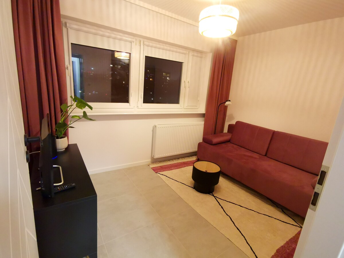 Te invitamos a alojarte en nuestro nuevo apartamento, que hemos preparado pensando en tu comodidad. El apartamento, situado en una nueva urbanización en el límite del centro, está amueblado y equipado para que los huéspedes se sientan cómodos tanto durante sus vacaciones como durante sus estancias de negocios. La ubicación conveniente permite llegar muy rápidamente a los principales lugares de Varsovia, así como llegar fácilmente en 10 minutos al aeropuerto y a las estaciones de tren de la capital.