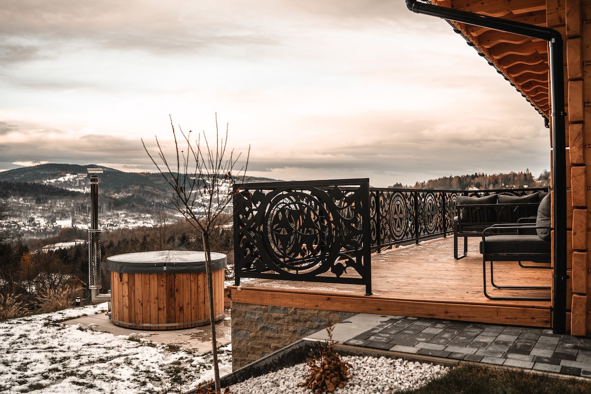 Find peace at "Closer to Heaven" a luxury retreat on Koskowa Mountain, 820m above sea level. Enjoy panoramic views of the Beskid Wyspowy and Tatra Mountains from a spacious terrace. This 88 sqm eco-friendly home is surrounded by 2,300 sqm of private land. Unwind in the year-round 5-person chlorine-free outdoor spa with 2 reclining massage seats. Pure spring tap water, an ice-maker fridge, and fast Wi-Fi add comfort. Trails, forests, and nature await – closer to heaven, closer to you.