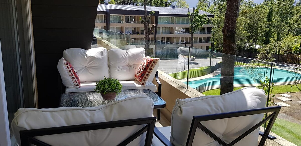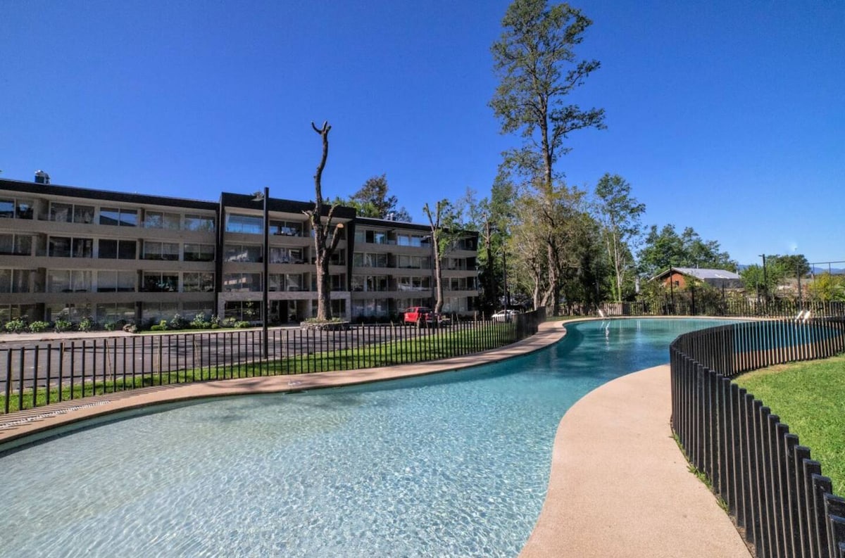 Relájate en un lugar con hermosas áreas verdes ,camino al volcán km 1 cerca centro de sky y centro de pucon. Dpto totalmente equipado , 1 dormitorio con cama king . Living con sofá cama para 2 niños , calefacción , Wifi TV , estacionamiento ,Terraza y piscina . Club house : Juegos electrónicos para niños Gimnasio ,bicicletas (sin costo ). tinajas , quincho ( costo adicional) lavandería (lavadora y secadora ) costo adicional (monedas de 500 pesos ) Conserjeria 24/7